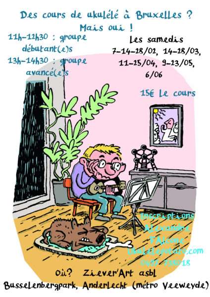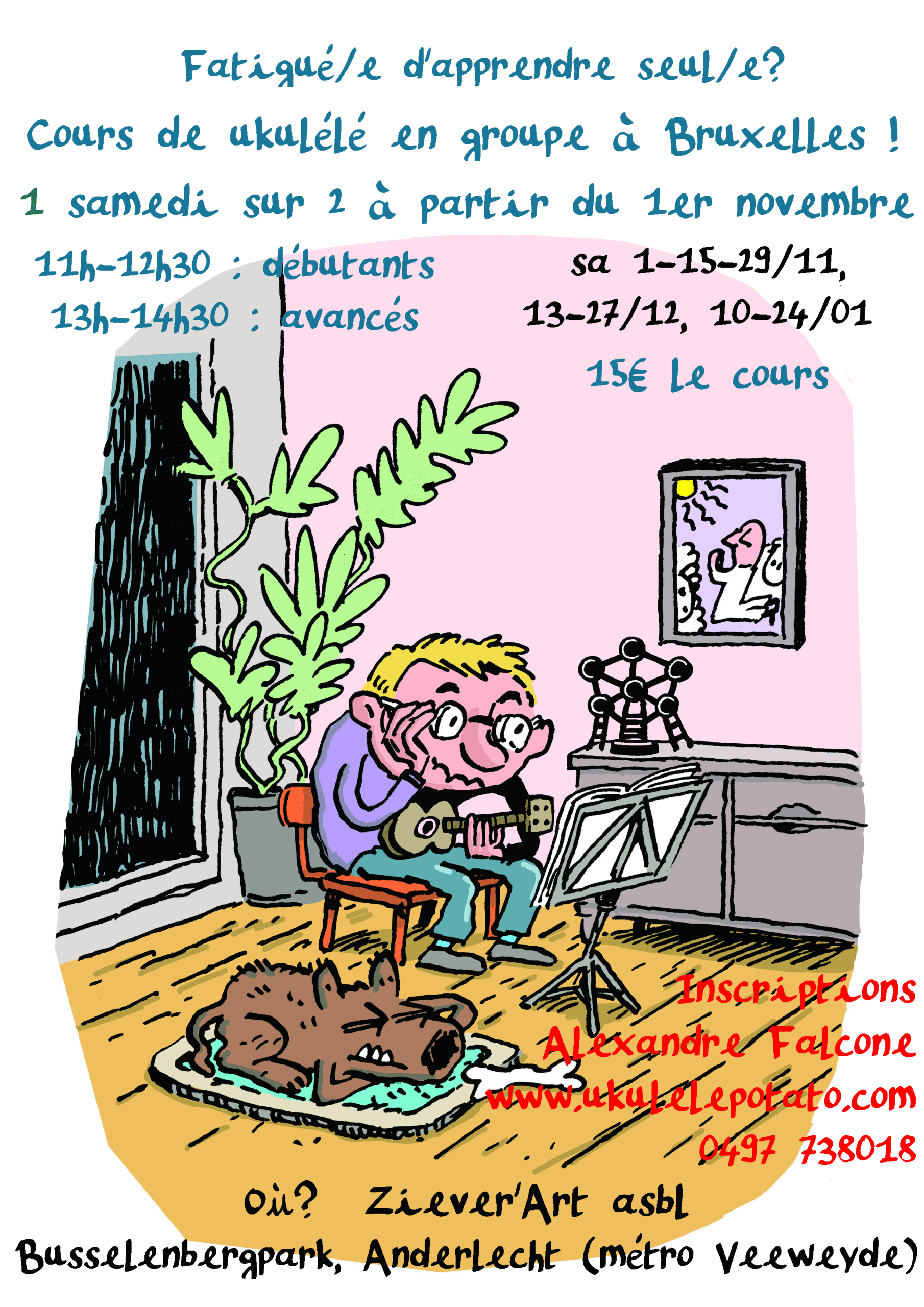 A partir du samedi 1er novembre, je donnerai toutes les 2 semaines des cours d’ukulélé en groupe. Ils se dérouleront à l’asbl Zieverart qui est installée au Busselenbergpark, à Anderlecht (à 200 mètres du métro Veeweyde) : quand vous arrivez par la rue du Busselenberg, rentrez dans le parc, le local se trouve dans l’ancienne école maternelle à votre droite.